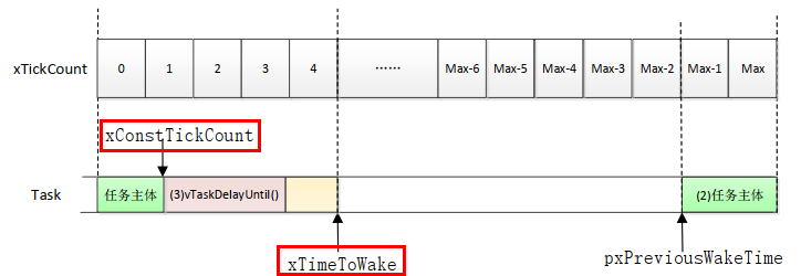 ① 从vTaskDelayUntil函数的实现可知,任务的唤醒时间是基于上次唤醒时间计算的,因此是一种绝对延时,也就是在固定周期内会唤醒任务