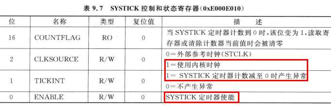 ② 在控制寄存器中,设置使用系统时钟,并使能中断与SysTick