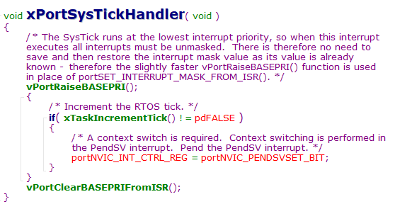 SysTick中断处理函数的核心是调用xTaskIncrementTick函数,并根据该函数的返回值,确定是否需要触发任务调度