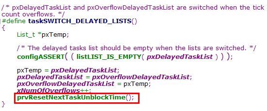 当系统tick计数溢出时,会调用taskSWITCH_DELAYED_LISTS宏交换延时列表